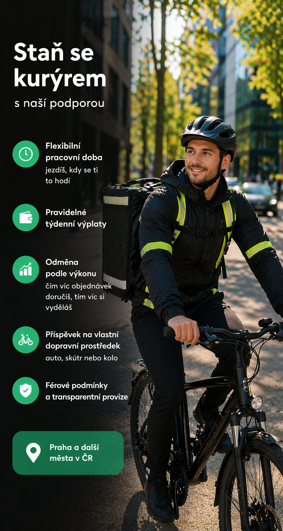 - Odměna podle výkonu – čím víc objednávek doručíš, tím víc si vyděláš